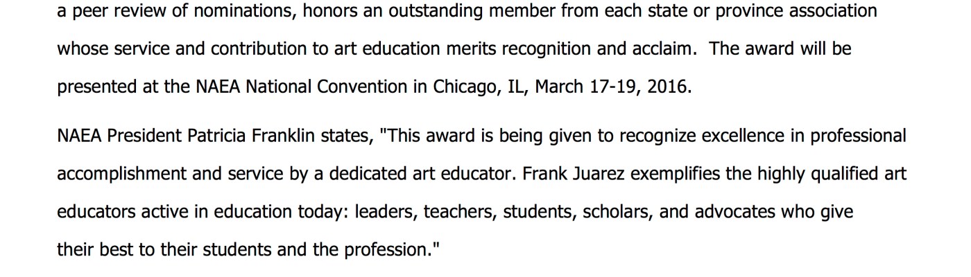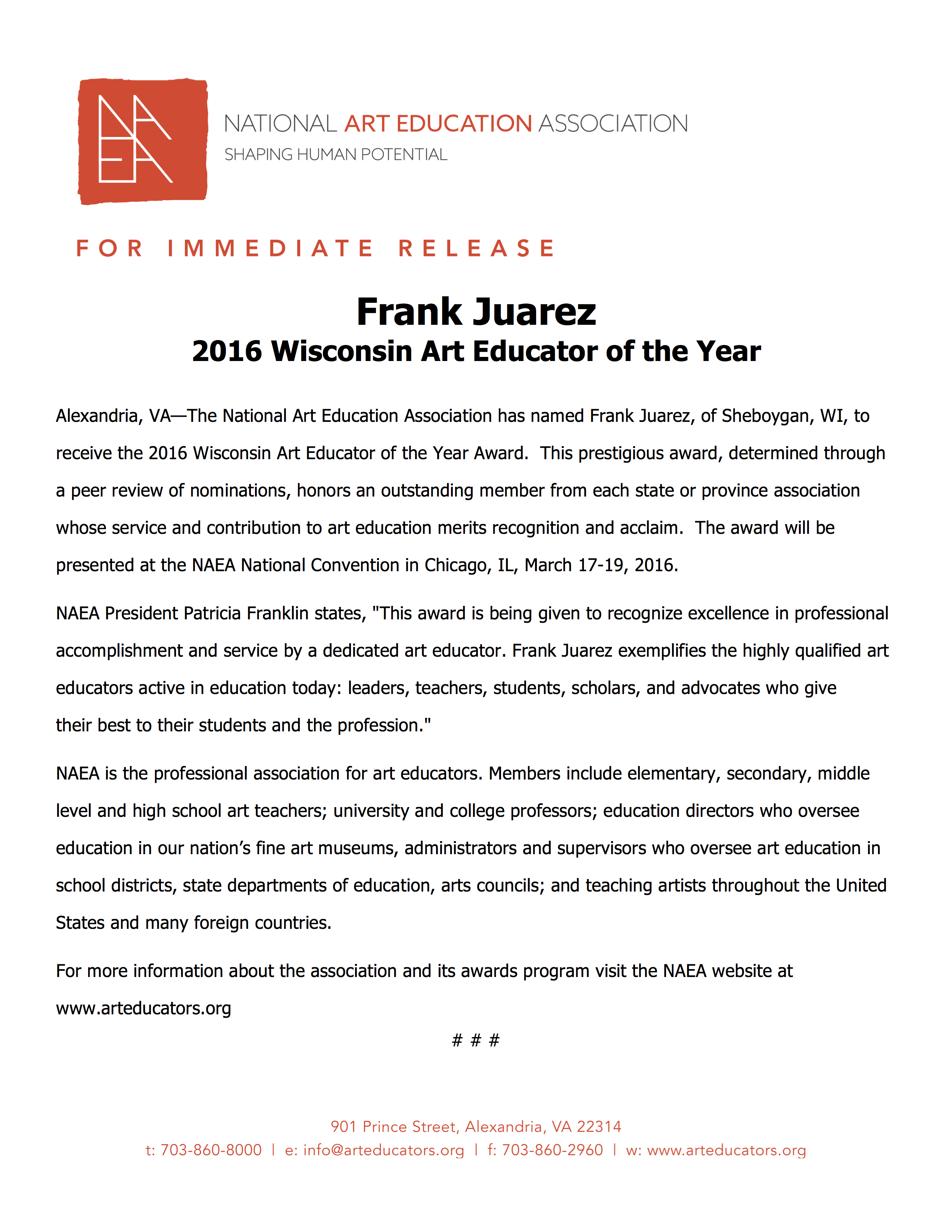 Frank Juarez: 2016 Wisconsin Art Educator of the Year Share this: Click to share on Facebook (Opens in new window) Facebook Click to share on X (Opens in new window) X Click to email a link to a friend (Opens in new window) Email Click to print (Opens in new window) Print Like Loading...