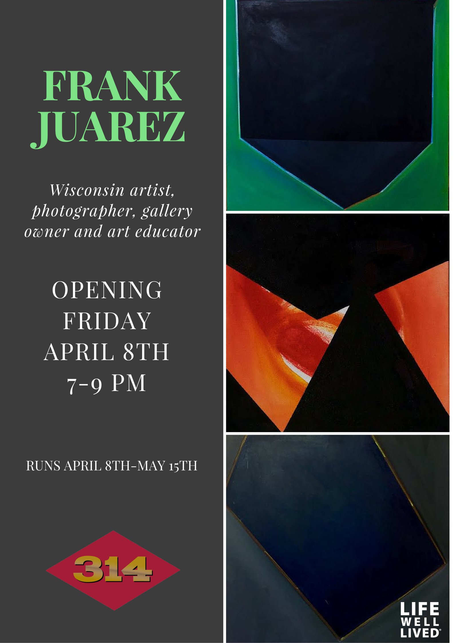 Frank Juarez @ Project Space 314, Ripon Project Space 314 314 Watson Street Ripon, Wisconsin 54971 April 9 – May 15, 2016 Gallery hours: Tuesday – Thursday 6-9pm Saturday 1-4pm Sunday 6-9pm Share this: Click to share on Facebook (Opens in new window) Facebook Click to share on X (Opens in new window) X Click to email a link to a friend (Opens in new window) Email Click to print (Opens in new window) Print Like Loading...