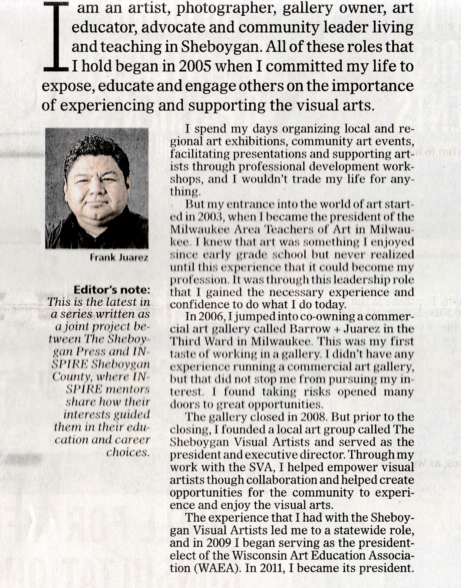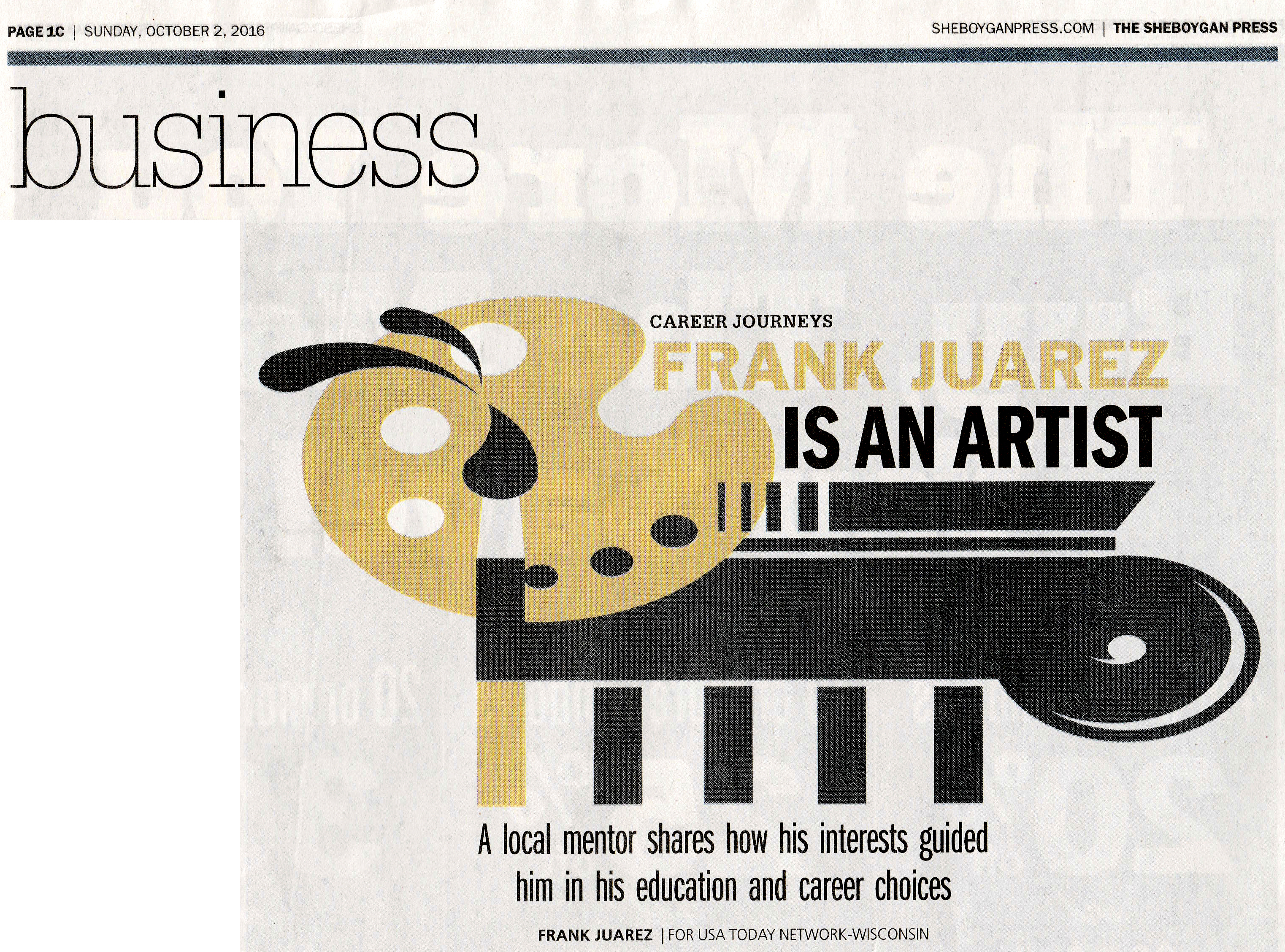 Career Journeys: Frank Juarez is an artist, Sheboygan Press (10/2/16) Share this: Click to share on Facebook (Opens in new window) Facebook Click to share on X (Opens in new window) X Click to email a link to a friend (Opens in new window) Email Click to print (Opens in new window) Print Like Loading...
