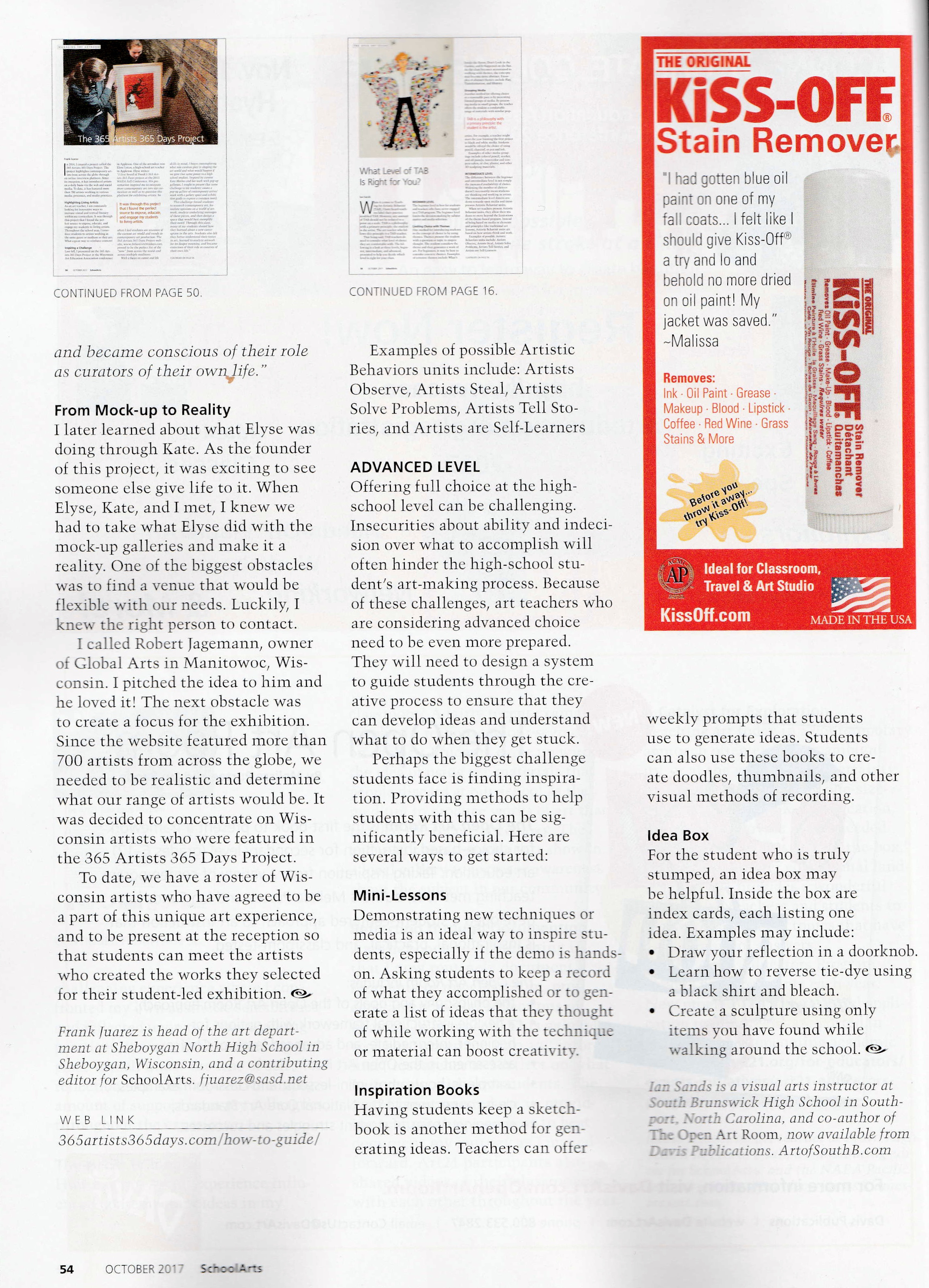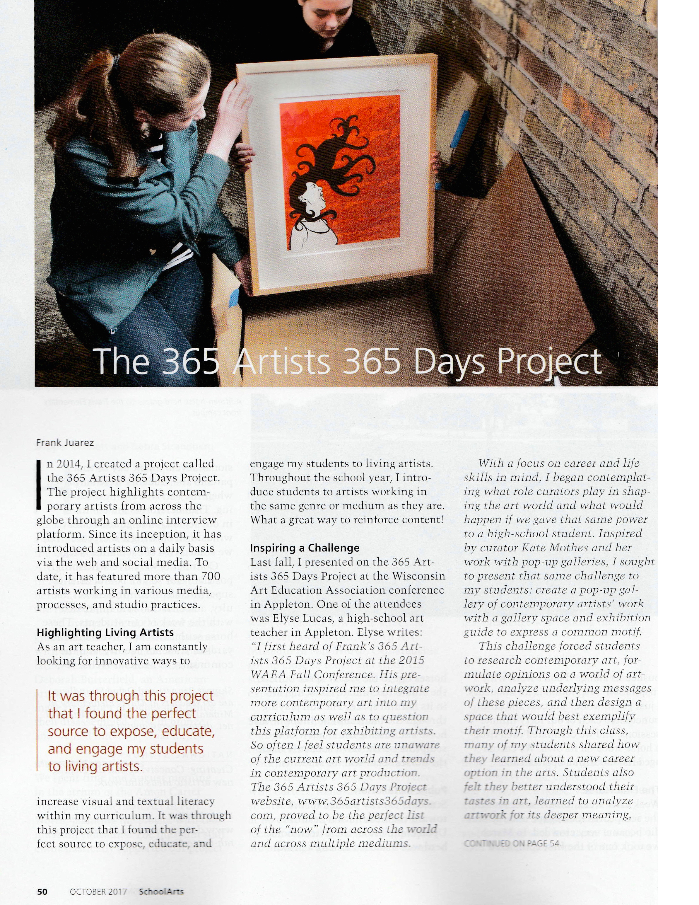 The 365 Artists 365 Days Project is featured in the October 2017 Issue of SchoolArts Magazine. Educators Frank Juarez and Elyse Lucas collaborated on a project that embraces curation, contemporary art, and community engagement.