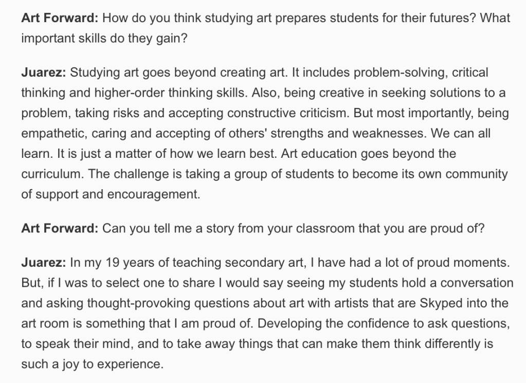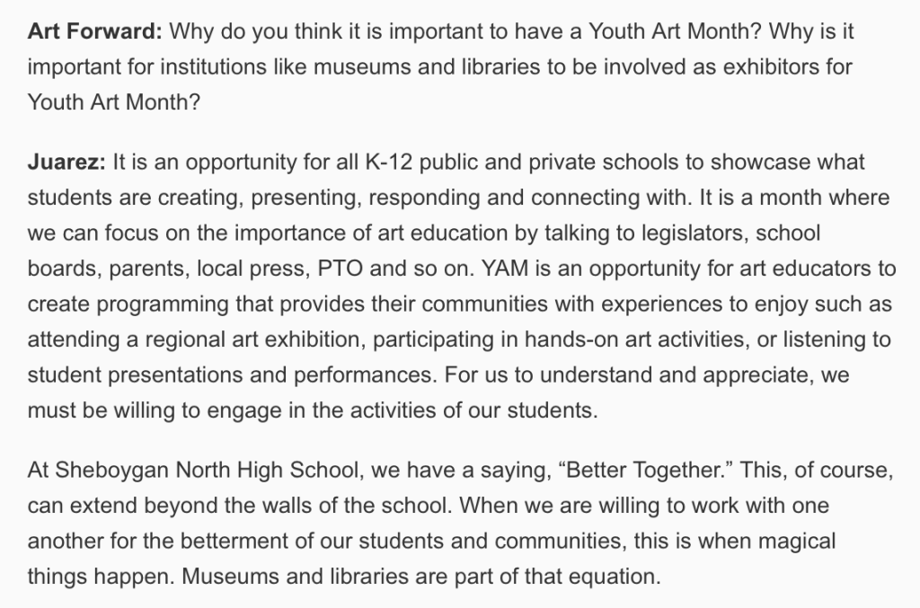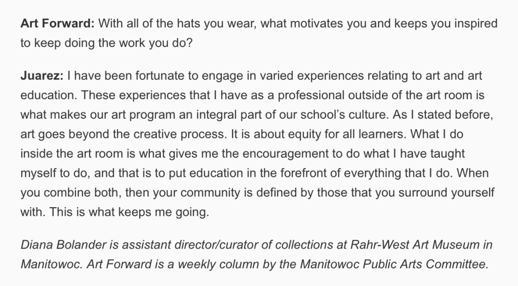 A chat with Sheboygan art teacher Frank Juarez | Manitowoc Art Forward written by Diana Bolander, For USA TODAY NETWORK-Wisconsin Share this: Click to share on Facebook (Opens in new window) Facebook Click to share on X (Opens in new window) X Click to email a link to a friend (Opens in new window) Email Click to print (Opens in new window) Print Like Loading...