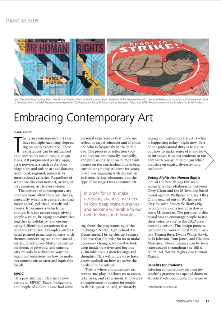 Point of View: Embracing Contemporary Art Published in the April 2021 Issue of SchoolArts Magazine Written by Frank Juarez Share this: Click to share on Facebook (Opens in new window) Facebook Click to share on X (Opens in new window) X Click to email a link to a friend (Opens in new window) Email Click to print (Opens in new window) Print Like Loading...