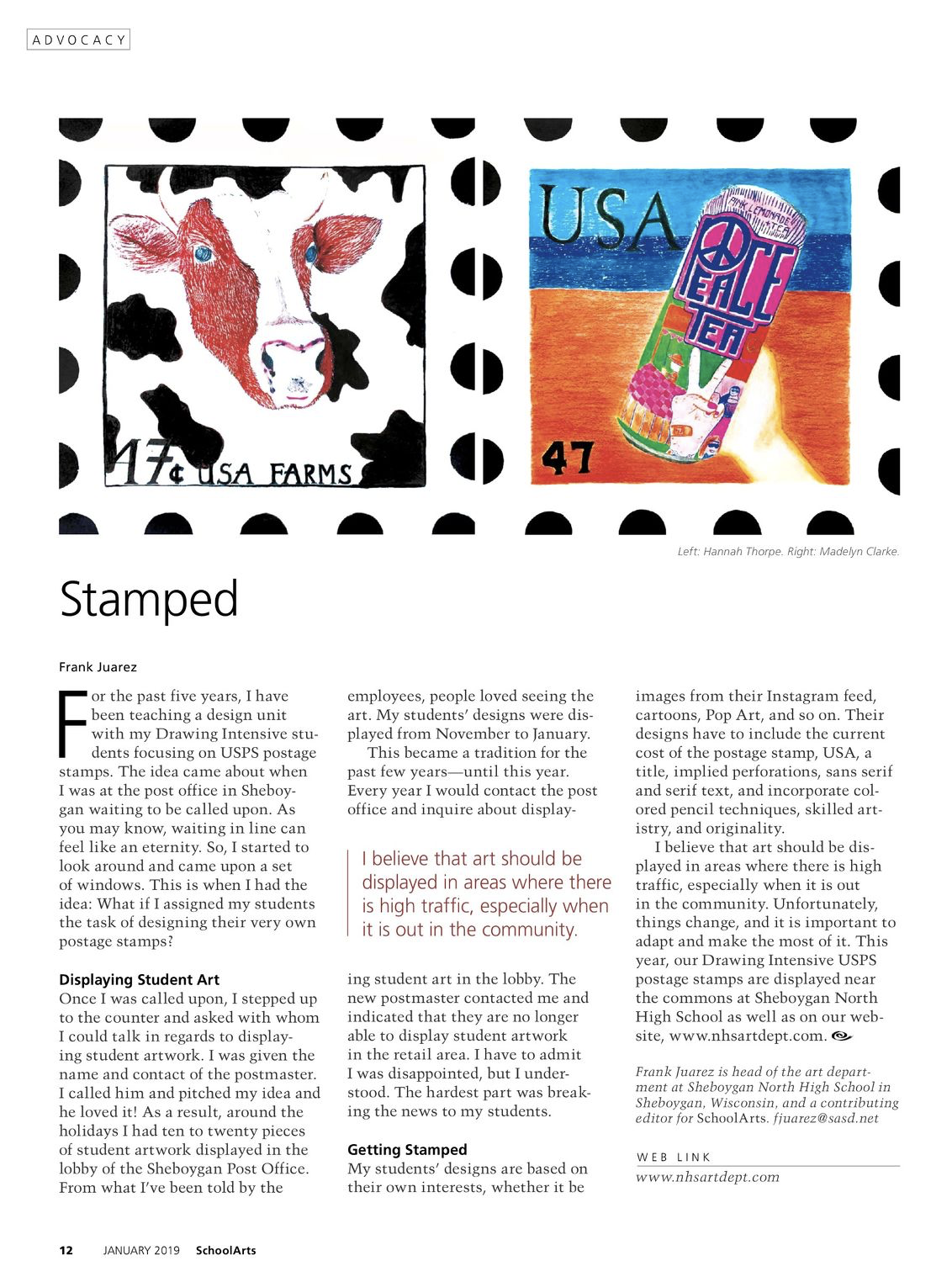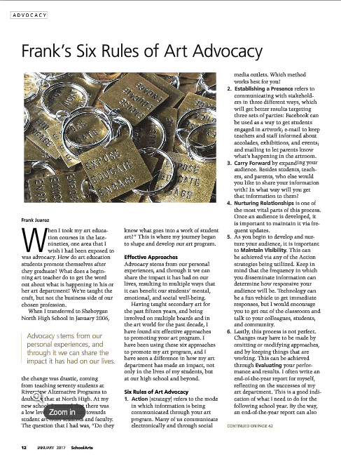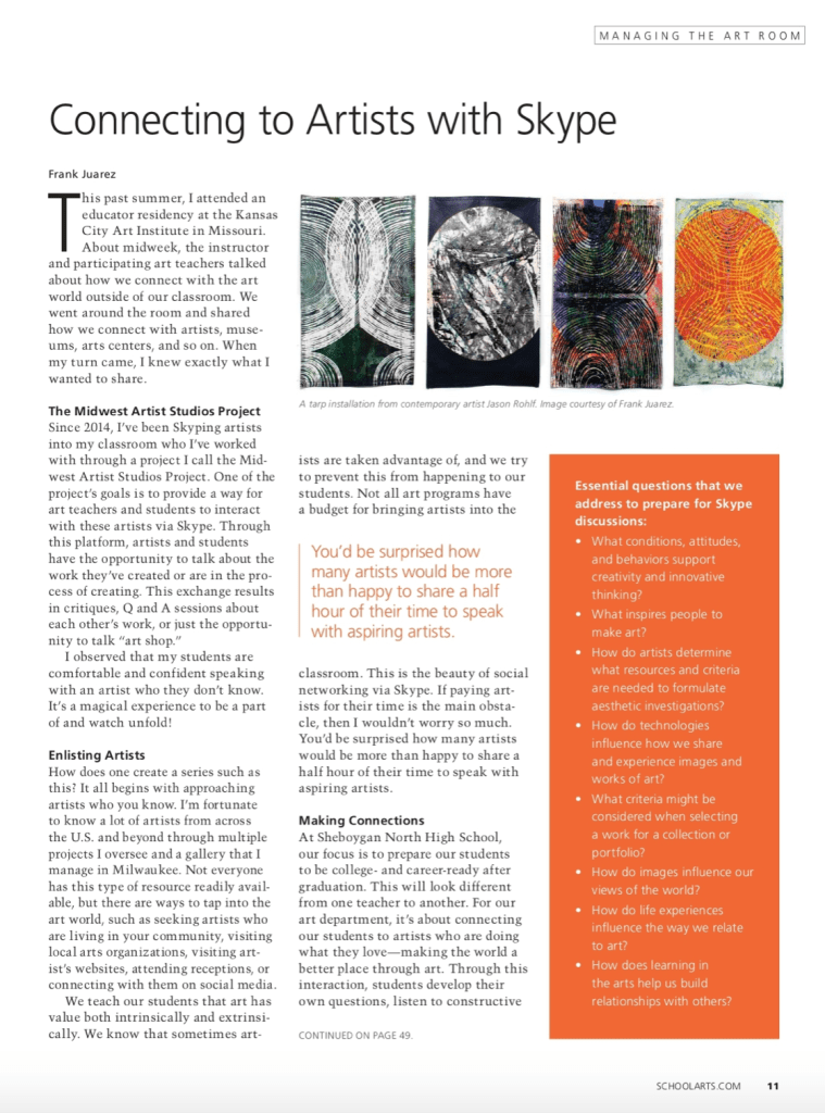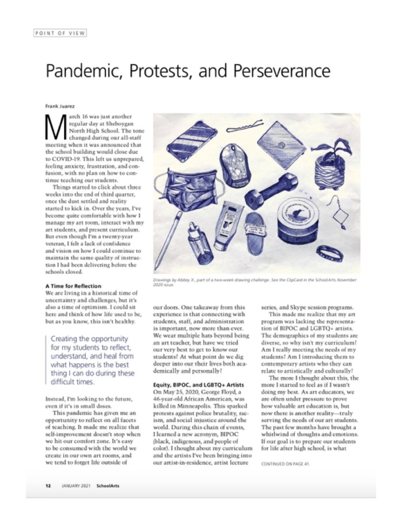 On December 6, Nancy Walkup, SchoolArts Magazine Editor in Chief, and Frank Juárez, SchoolArts Magazine Contributing Editor and art educator, sat down virtually with Matt and Laura Grundler of K12 Art Chat the podcast to talk about the importance of getting published in SchoolArts Magazine. SchoolArts Magazine has been an integral part of our art program at Sheboygan North High School. What began with an a Clip Card in the March 2015 has turned into published articles to a couple of issues with my students’ art on the cover, co-editing three issues for SchoolArts Magazine to writing a foreword for the newest addition to SchoolArts Collection: Contemporary Art.