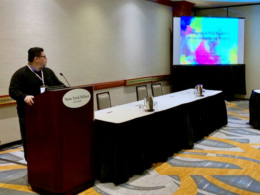 On Thursday, March 3rd, I presented on designing a post-pandemic artist-in-residency program at Sheboygan North High School. Similar to multiple programs across the U.S., this eight year program was impacted by the pandemic. What started as an in-person artist-in-residency program (2013) abruptly was faced with operational challenges into unknown territory (2020). These challenges forced the program to pivot and explore other options to offer our staff and students the continued opportunity to engage with local artists on a semester basis. This school year we offered artists the option to either participate in-person or virtually (2021-2022). We are still experimenting and will have a more realistic outlook and plan for the next school year.