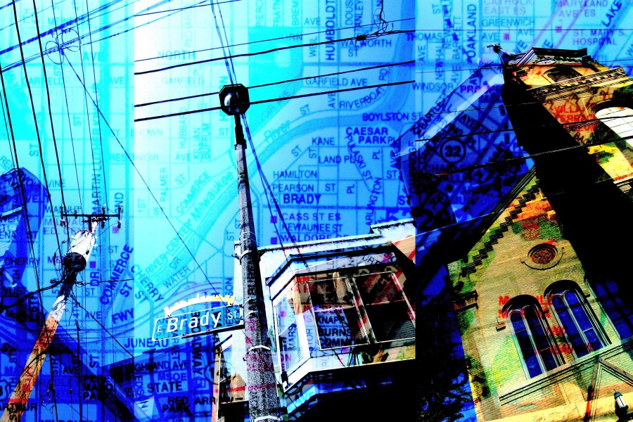 Anita Burgermeister, Brady Street Rooftops,Digital art layered with maps (and often painted abstract or textured backgrounds) printed on aluminum, 2 x 3 feet