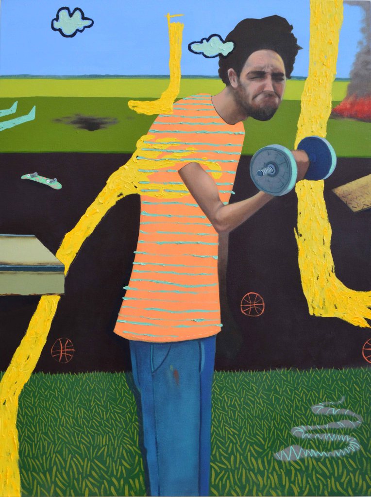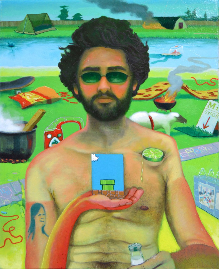 Acuna’s art weaves together themes of his rural Midwest upbringing, a conflicted relationship with his Mexican heritage, and the human body as a social and cultural signifier. Within his mixed media practice, he traverses a multitude of subject matter and media by collecting, integrating, and juxtaposing visual information. Building on a foundation of autobiography; he looks to better understand the complexities and preconceptions of brown male identity in the United States. Multiplicity functions as a thematic compass for both process and concept in his practice, and diversity develops in the varied visual languages of representation and abstraction. Through a layering of form and meaning he continually examines a sense of belonging between the figure and ground. Symbols and references reappear throughout the surfaces of his work inviting viewers to explore humorous, exaggerated, and uncanny chapters of an ongoing personal mythology. It is his belief that through a consistent practice of depicting natural light, form, and color he can best discover and describe new ideas in his studio. Painting has centered and grounded his approach to image making where familiar and unfamiliar subjects may coexist.