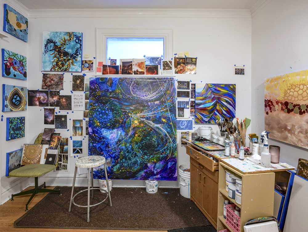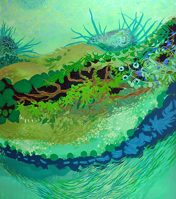 Renee Robbins is a Chicago-based visual artist who layers biomorphic forms to create detailed otherworldly environments. She has large-scale public mural commissions in Chicago on Lake Michigan in Lincoln Park and in the South Loop. She has exhibited widely, including exhibitions at Lois Lambert Gallery, Santa Monica, CA; Peggy Notebaert Nature Museum, Chicago, IL; Fermi National Accelerator Laboratory, Batavia, IL; and the Alden B Dow Museum of Science and Art, Midland, MI. Press includes TV interviews on PBS, print features in Chicago Gallery News, Inside/Within, NewCity Art, and a podcast interview with Ahtcast. Honors include four grants from the Chicago Department of Cultural Affairs as well as a grant from the Illinois Arts Council. Robbins received her MFA from Michigan State University and has been working in Chicago since 2007.