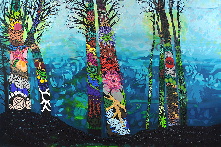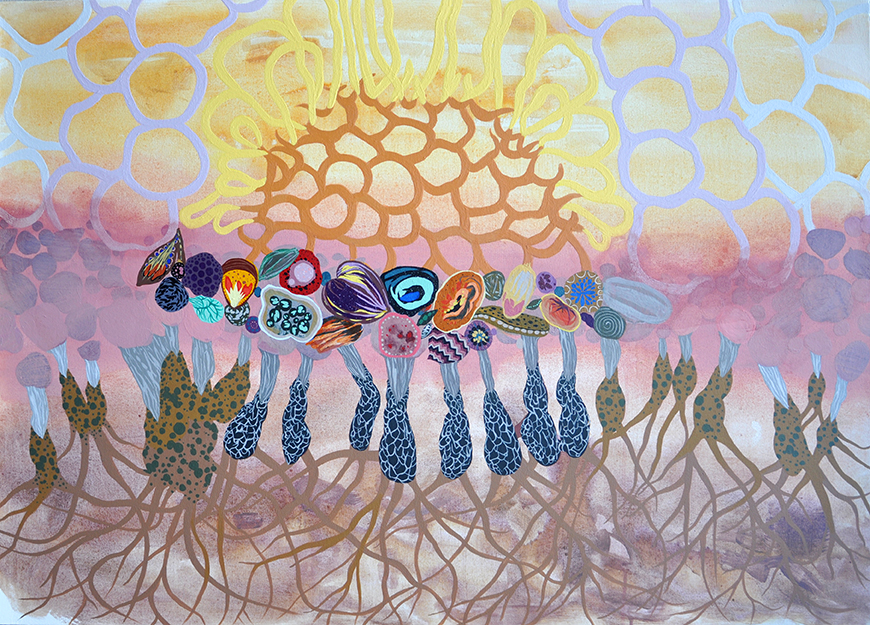 Renee Robbins is a Chicago-based visual artist who layers biomorphic forms to create detailed otherworldly environments. She has large-scale public mural commissions in Chicago on Lake Michigan in Lincoln Park and in the South Loop. She has exhibited widely, including exhibitions at Lois Lambert Gallery, Santa Monica, CA; Peggy Notebaert Nature Museum, Chicago, IL; Fermi National Accelerator Laboratory, Batavia, IL; and the Alden B Dow Museum of Science and Art, Midland, MI. Press includes TV interviews on PBS, print features in Chicago Gallery News, Inside/Within, NewCity Art, and a podcast interview with Ahtcast. Honors include four grants from the Chicago Department of Cultural Affairs as well as a grant from the Illinois Arts Council. Robbins received her MFA from Michigan State University and has been working in Chicago since 2007.